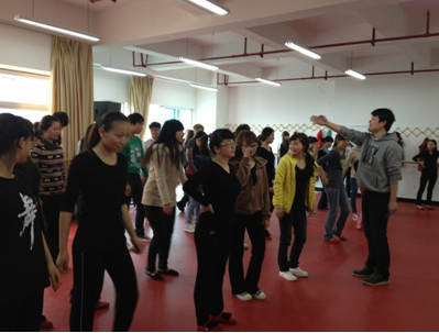 上课班级为2011级音乐表演专业的学生,课程内容是成套的形体舞蹈教学及训练,充分利用音响设备等教学资源,并发挥学生的学习主动性。整个课堂氛围轻松活跃,学生在“玩”的过程中完成的自己肢体的美感、协调性及节奏感的训练。