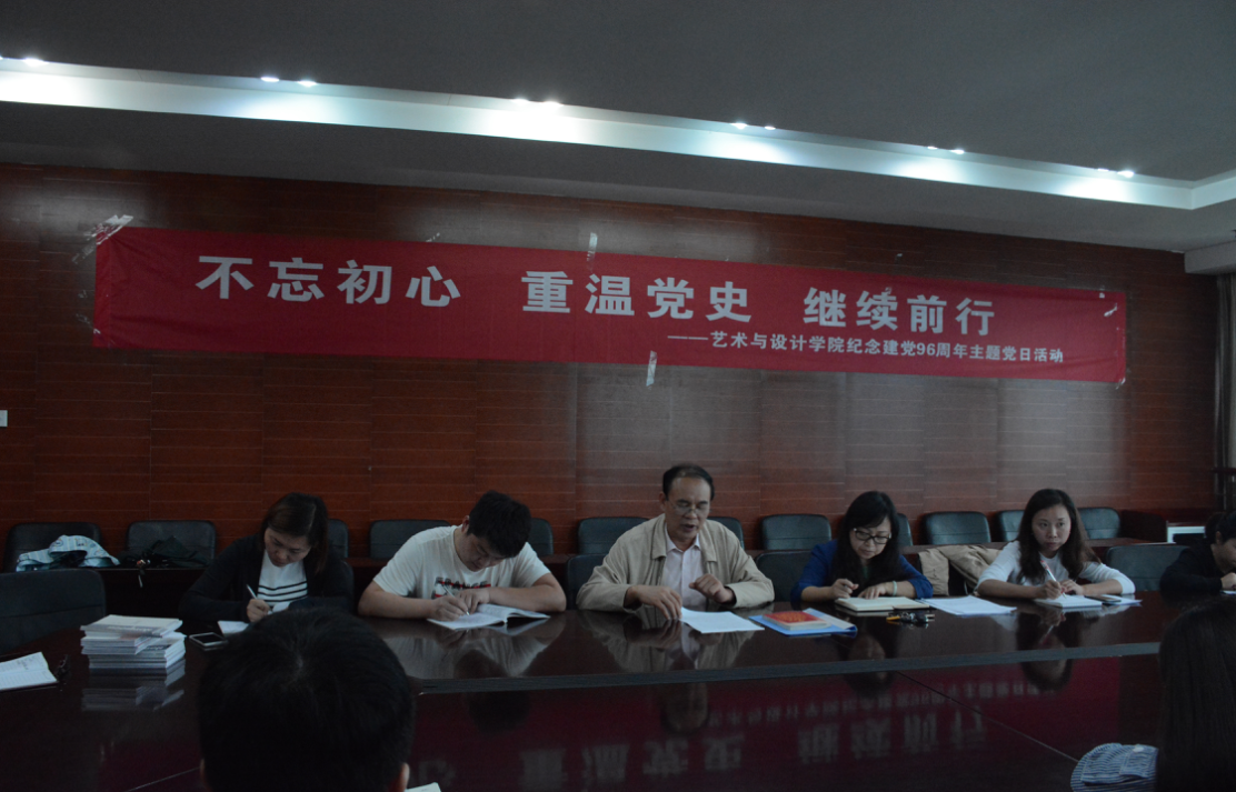 2017年6月27日下午,我院全体党员教工在行政楼8楼会议室开展庆祝建党96周年主题党日活动。活动有三项议程,分别是:1、讲党课;2、学期工作总结及下学期工作安排;3、重温入党誓词。