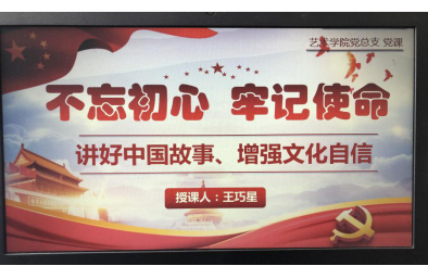 党课上王巧星副书记从如何讲好华夏文明故事、红色革命故事、改革开放故事、中西差异故事出发。我们艺术专业的师生是艺术文化的传播者,必须树立高度的文化自信,必须搭建讲好中国故事的平台、提升讲好中国故事的能力。大学生文化自信欠缺的现状影响着中国故事的传播,而我们的老师在引导大学生客观理性地认识中华文化方面承担着特殊的使命,以高度的文化自信向其讲好讲活中国故事,传播好中国声音,才能更好地坚定大学生理想信念。