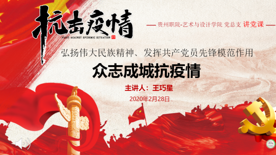 2020年3月9日艺术与设计学党总支开展主题为《抗击疫情、弘扬伟大民族精神、发挥党员的先锋模范作用》的专题党课。此次党课由我院党总支书记王巧星同志通过网络视频课方式展开。这是一堂全新方式的空中党课学习。