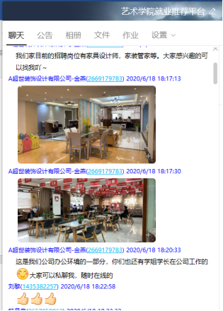 艺术学院就业推荐平台于4月份成立,是为了在疫情期间方便用人单位进行线上宣讲、信息的发布,同时为了我院毕业生与用人单位进行高效的就业交流而建立的。自平台成立以来,学院全体老师积极推荐用人单位进群,共邀请三十余家用人单位进群,发布各类招聘信息百余条,提供就业岗位二百多个。同时,我院就业平台为未就业的毕业生在群相册里提供了简历展示,方便用人单位了解毕业生,为我院毕业生高质量就业提供了有利的保障良好的就业平台。