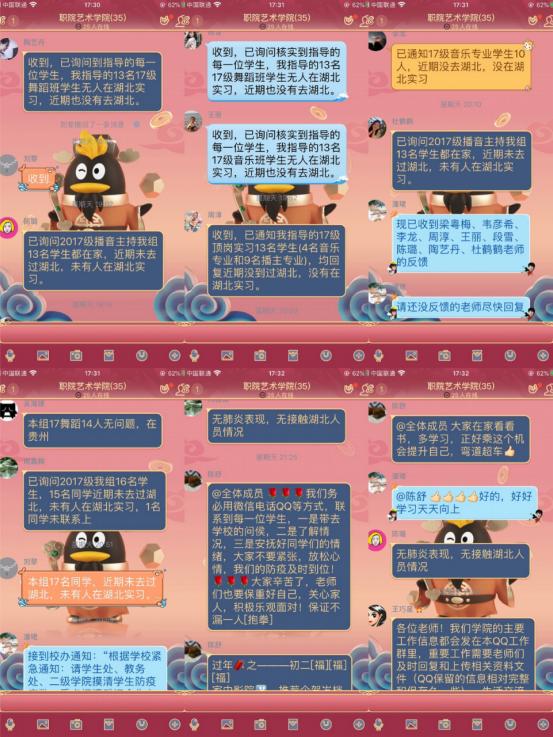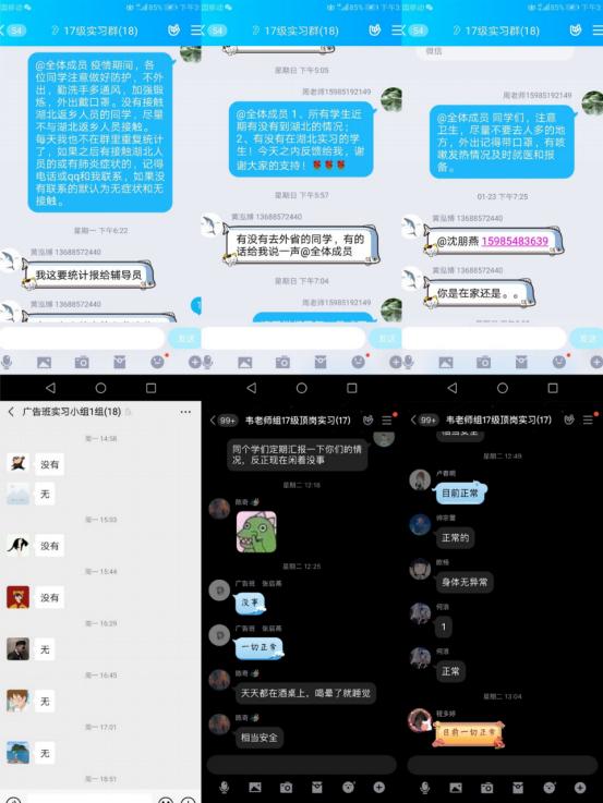 为确保这些师生的健康安全,学院领导、辅导员、班主任利用微信、短信、电话等通讯工具每天联系他们,嘘寒问暖,及时了解和关心他们的身体状况。班主任、辅导员等通过学院教师微信群、班级微信群、每日日报微信群等开展“日报告”和“零报告”,并将每日师生疫情排查信息及时上报学校。