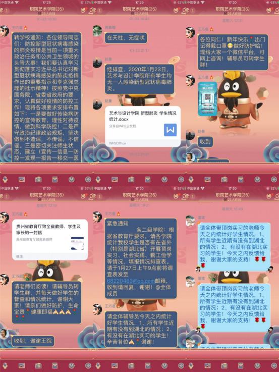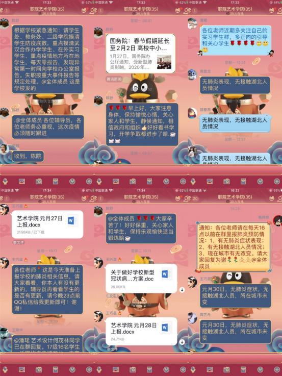 成立疫情防控工作领导小组。根据省教育厅相关文件要求,学院于1月23日成立了由书记王巧星和院长陈舒任组长,副院长潘珺任副组长,学院专职组织员、团总支书记、办公室人员及辅导员为组员的艺术与设计学院新型冠状病毒感染的肺炎疫情防控工作领导小组。制定疫情防控工作方案。一是做好宣传教育和舆情工作。第一时间将上级部门和学校疫情防控指示精神、疫情防控知识等关键信息通过短信、微信、QQ等发送给师生,引导广大师生做好疫情防控工作,教育广大师生自觉按照科学指引,做好个人防护,不恐慌,不信谣,不传谣,维护社会大局稳定,决不允许出乱子、掉链子、捅娄子。二是实时掌握师生动态,做好疫情筛查和报告工作。了解和掌握师生假期动向,对本单位师生假期动向进行排查,及时向疫情防控工作领导小组汇报。
