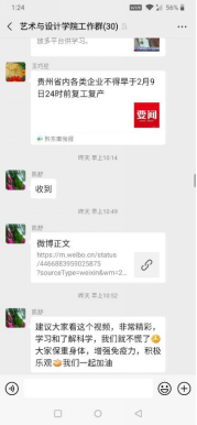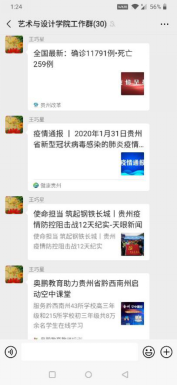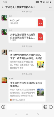 艺术学院班子认真学习中央、省委、教育厅以及学校各项通知和精神,2月1日在学院工作群及时转发全国及贵州省新型冠状病毒感染的肺炎疫情情况、《贵州日报》刊发《使命担当 筑起钢铁长城——贵州疫情防控阻击战12天纪实》、贵州省教育厅发布通知——全省普通本科高校不得提前开学、学生不得提前返校的通知、《省教育厅办公室关于转发< 教育部职成司关于加强新型冠状病毒肺炎疫情防控期间学生实习实训管理工作的通知>的通知》、《省疫情防控领导小组办公室发布重要提示》以及贵州广播电视大学(贵州职业技术学院)每日“疫”报(2020年2月1日)等。