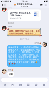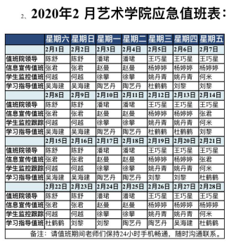 为进一步落实好学校元月31日会议精神和相关工作要求,针对近期已是“新型冠状病毒感染肺炎”的高发期,做好防控病毒感染的肺炎疫情这项公共卫生的大事,艺术与设计学院在原值班按排的基础上,再次优化应急工作和值班方案,每日值班都由院领导+宣传员+信息员+学习指导的老师组成,负责一天的师生信息填报、汇总上报、宣传和网上学习指导等工作。由学院各岗位教师值守构织出一个艺术学院网上家园,虽隔千里、心在彼此、关爱在交流的信息间。