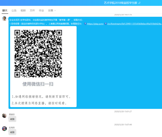 为深入贯彻习近平总书记坚决打赢疫情防控的人民战争、总体战、阻击战的要求,落实好省委、省政府、省教育厅扎实上好返校复学第一课的要求,加强大学生爱国主义教育和思想政治引领,结合学校《关于组织观看2020年春季学期“复学第一课”的通知》要求,2020年5月29日,艺术与设计学院组织全体师生做好现场和网络同步观看“复学第一课”的相关工作。