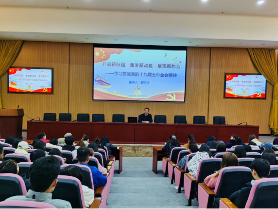 为深入学习贯彻党的十九届五中全会精神,2020年12月08日下午,艺术与设计学院邀请学校领导郭万才以“开启新征程,激发新动能,展现新作为——学习贯彻党的十九届五中全会精神”为题开展了专题宣讲会。艺术与设计学院党政领导班子和全体教师、学生代表200余人聆听了讲座。讲座由党总支书记王巧星同志主持。