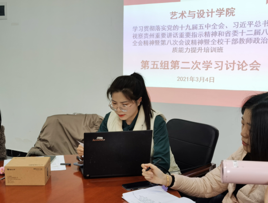按照我校关于学习贯彻党的十九届五中全会、习近平总书记视察贵州重要讲话和省委十二届八次会议精神暨全校干部教师政治能力培训班的安排,2021年3月4日下午,培训班第五组全体成员即艺术与设计学院全体教职工在科研楼134会议室开展第二次学习讨论会,本次学习讨论会由艺术与设计学院党总支书记王巧星同志主持。
