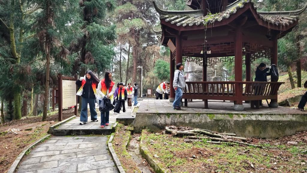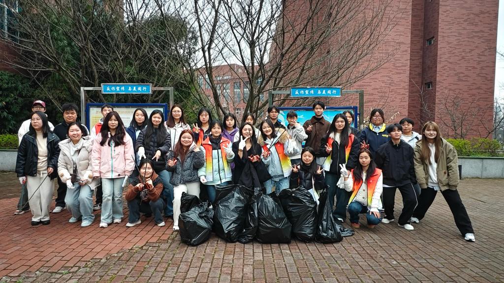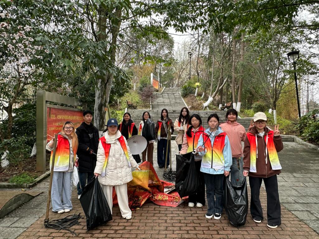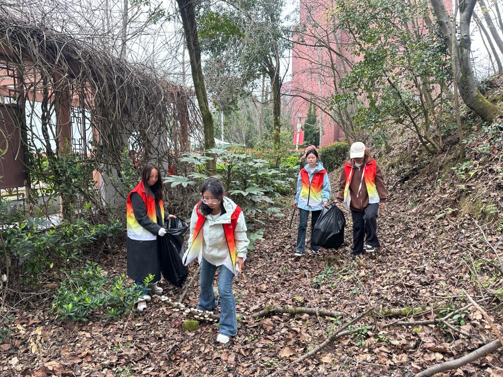 随后,全体师生分为两组,对大松山、银杏大道、小松山等区域进行了细致清理。大家分工协作,认真捡拾树丛中、路边及山坡上遗留的果皮纸屑等垃圾,不放过任何一个角落。参与活动的同学们表示:“来到学校半年了,还没从大小松山上欣赏过校园的美丽。今天用自己的微薄之力为校园的春天增添了一份绿意,感到非常有意义。”