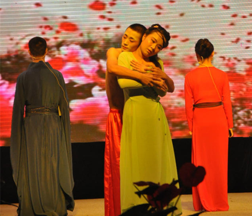 舞台上,与其他参赛队伍不同的是我们参赛选手更多采用的是舞蹈戏剧的形式来展现《红楼梦》中“宝哥哥”与“林妹妹”的曲折爱情。歌队生动形象的诉说,舞者夸张的动作,扣人心弦的音乐交融在一起,组成一幅立体的画面,把现场的观众带入到他们的世界,十二分钟的演出,掌声响起了四五次。