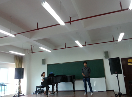 2011级音乐表演班,于10月29日下午2点在D702排练厅,举行了《声乐》课程学期结业考试。考试形式:每人进行一首作品的完整演唱,由两位评委老师打分,并取平均分作为同学们的最终成绩。邀请到,贵州师范大学硕士研究生张馨之老师、莫太极老师担任评委,本次学期考试同学们认真对待,超出平时水平发挥。