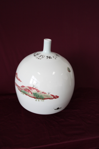作品名:《寒江独钓图》 材料:釉里红、高白泥