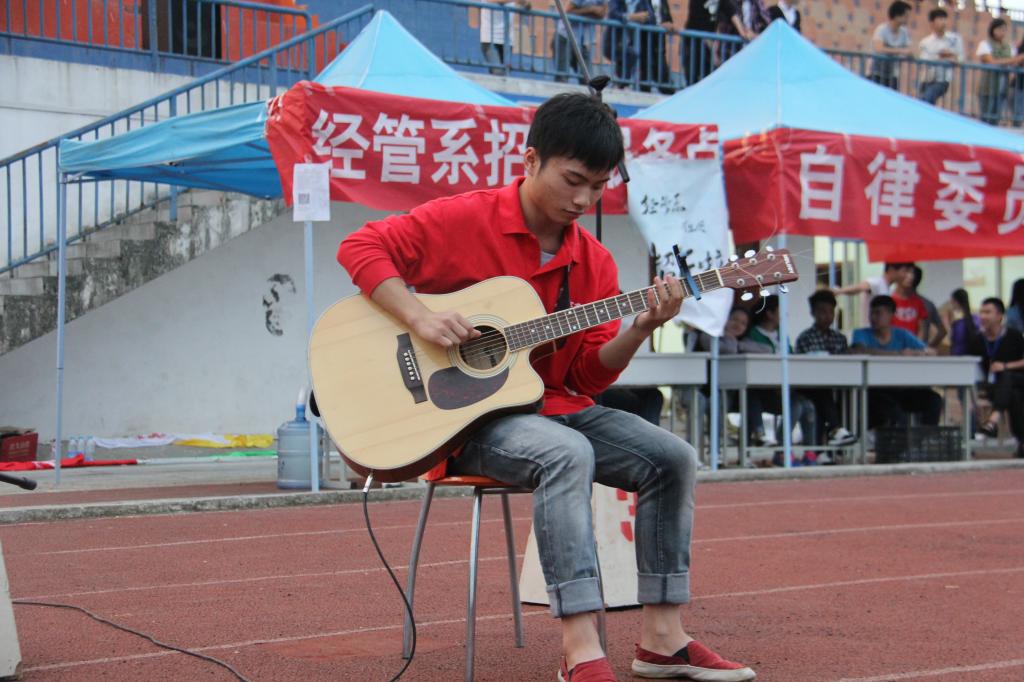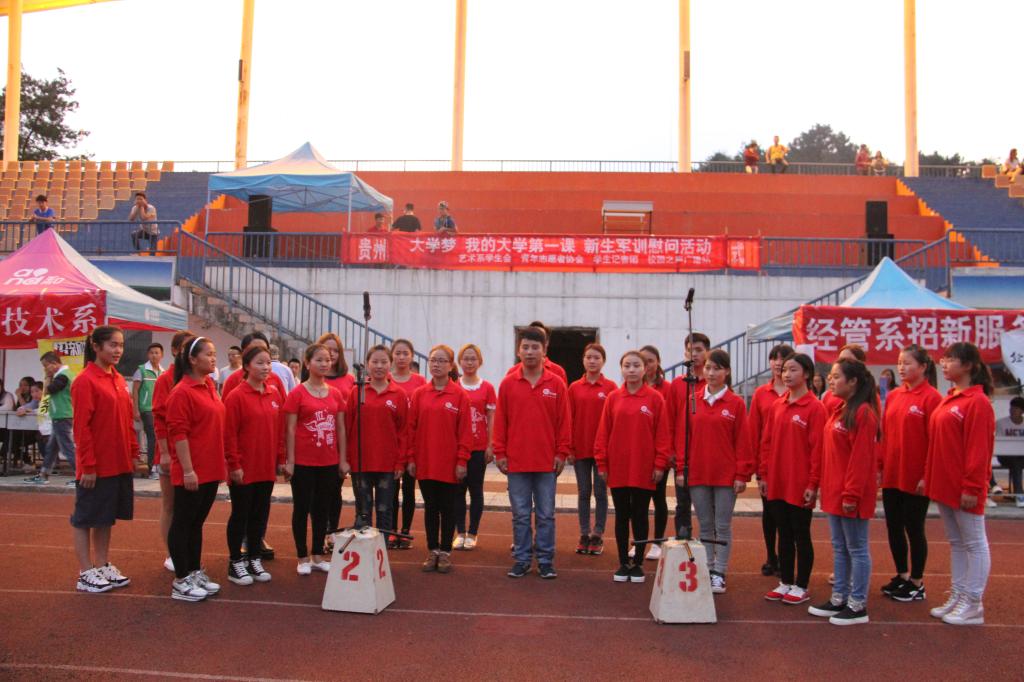 2015年9月16日晚七点在贵州职业技术学院足球场由艺术系学生会、青年志愿者协会、学生记者团组织展开了第七场军训慰问演出。首先是艺术系13级音乐表演班石怡和张雄学长给大家带来了动听的吉他独奏和慷慨激昂的歌曲《红旗飘飘》。他们在用他们的方式向祖国致敬。