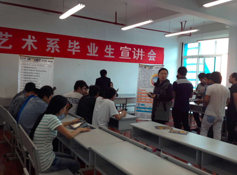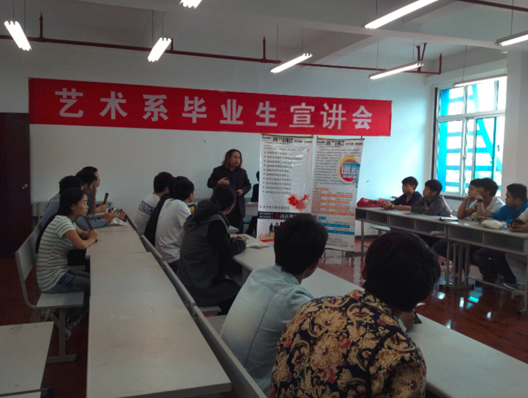 10月30日下午在B栋502教室我系举办了艺术系小型企业宣讲会,为2015届毕业生就业工作提早作好准备。这次来我系进行宣讲的是贵州创艺装饰有限公司。创艺装饰贵阳分公司成立以来,在贵阳同行业中创造了辉煌的业绩,并成为了贵阳家装行业的领军企业。我系辅导员杜菁和张君老师参加了此次活动。