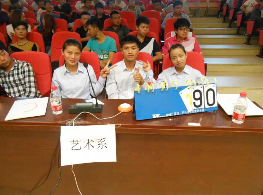 我系参赛队成员由2013级艺术设计班韦学英、2013级播音主持班文朝洪和李兴琴3名同学组成。必答题、抢答题、风险题三个环节下来,我系与信息系战成平局,最后通过附加赛决出胜负,我系队员在此轮表现出色,最终以290分的全程最高分夺得桂冠。同时我系何洁老师荣获最佳指导教师称号。通过此次竞赛,培养了同学们的团队精神和正确的就业意识,充分展示了我系学生的积极向上的精神风貌。