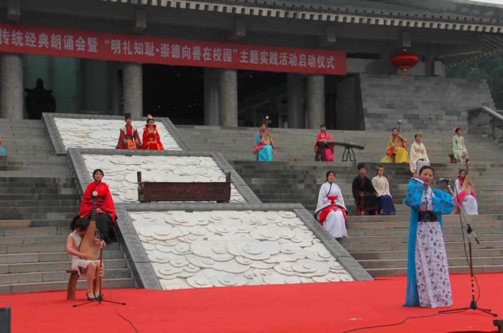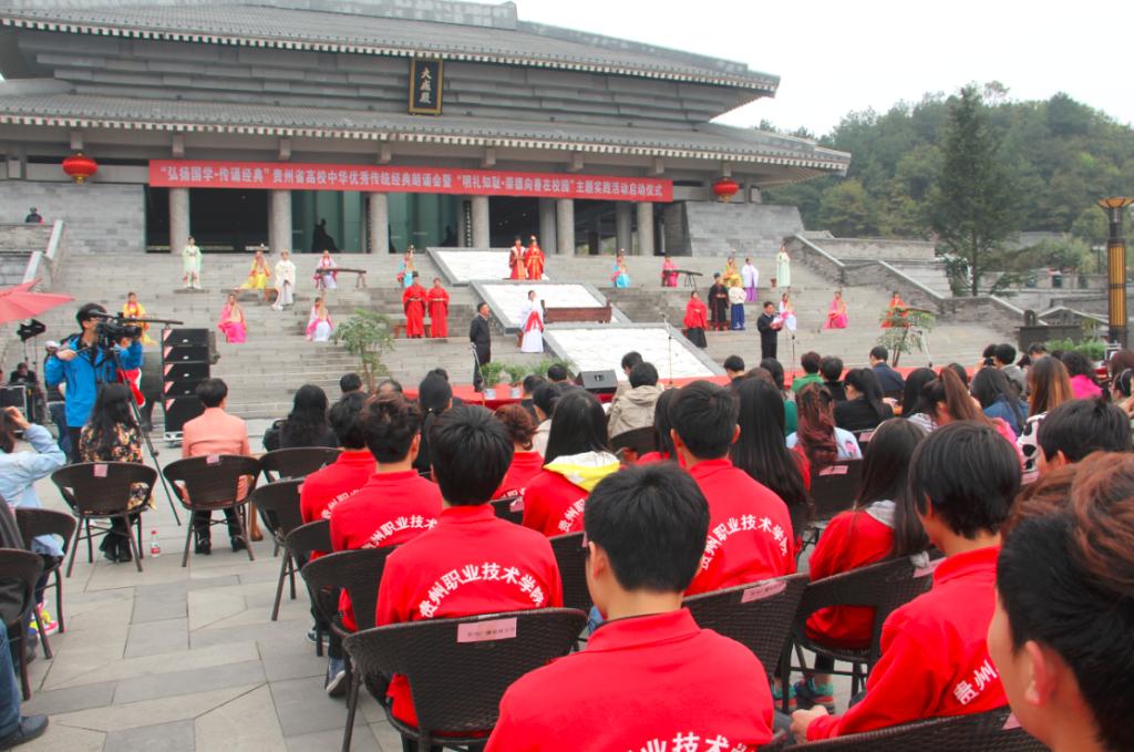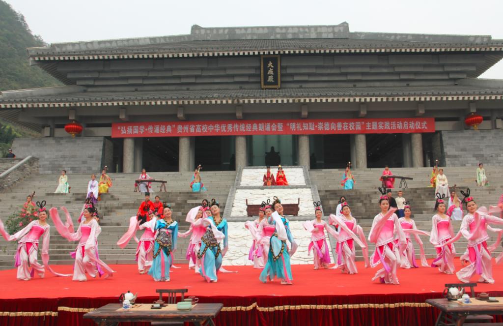 4月3日下午3点贵州省教育厅组织“弘扬国学·传诵经典”贵州省高校中华优秀传统经典诵读会暨“明礼知耻·崇德向善在校园”主题实践活动启动仪式在花溪孔学堂举行。院党委宣传部张仁俊部长、姚楠老师和团委陈鹰书记组织艺术系20名师生参加了此次活动。