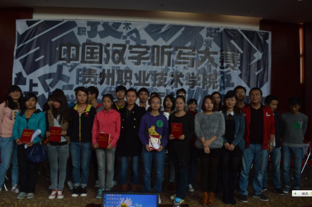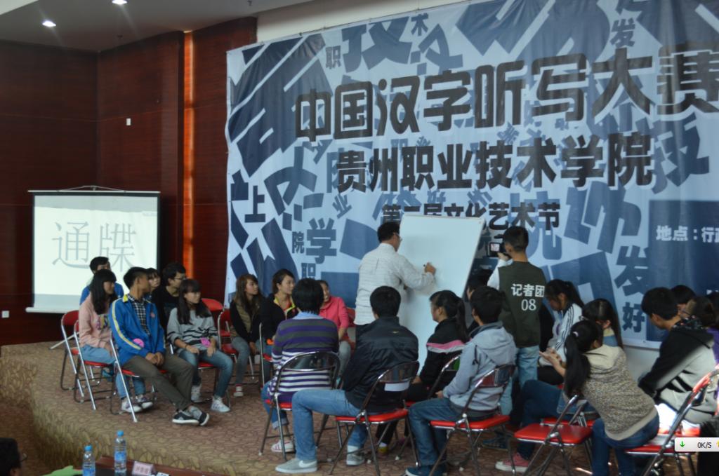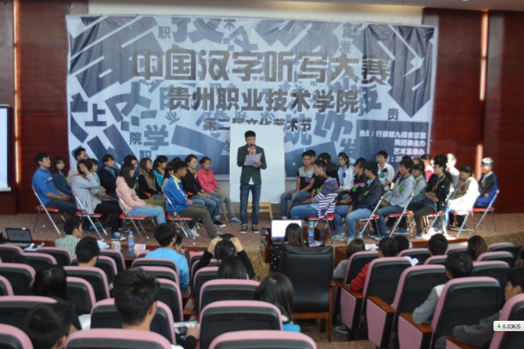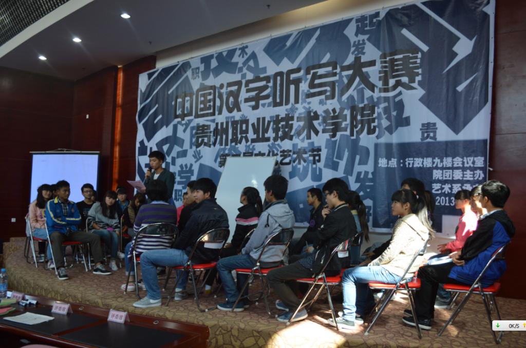 中国汉字听写大赛要求全院学生参加,各系经过初赛的挑选,最终选派5名选手代表本系参加决赛,共有7支代表队参加此次决赛。决赛采取逐人淘汰制,各方队按照抽签顺序排列,各队轮流派出一名队员比赛。每次只有一位选手走到主竞赛区进行比赛。主考宣读考题词汇、提供基本解释之后,每位选手有30秒时间书写答案。选手必须用规范简体汉字工整书写。几位评委分别给出裁定结果。主考根据评委裁定宣布结果。书写正确的选手立即返回自己的座位,等待下一次出场。书写错误或超时的选手将被淘汰。最终获胜者即为贵州职院汉字听写大赛的冠军队。 本次比赛参与面广,各个系部均进行了初赛选拔;从初赛到决赛,指导老师积极参与,学生精心备赛:比赛题目新颖、涉及面广,切合学生的学习、生活实际;竞赛题目内容涉及常用汉字和生活词汇等,选择其中与日常学习生活关系密切的内容,使本次竞赛真正成为规范使用汉字的试金石和练兵场。