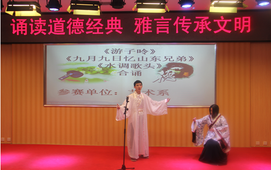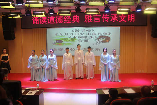 在此次比赛中,我系代表队以独特的诵读设计、最具专业特色的舞台表演将合诵诗篇的情感表达得淋漓尽致,以较高的艺术性、思想性征服了现场评委和观众,以9.62分的高分获得了此次比赛的一等奖。