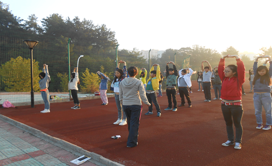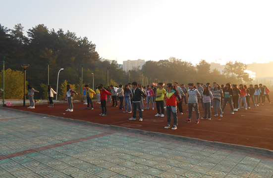 伴随秋日的第一缕阳光,足球场上总会看到艺术系2013级全体同学认真参加早锻炼的身影。针对我系音乐表演专业、主持播音专业的专业特殊性及专业基础能力的培养,每天早操中,集体做完十分钟的准备活动后,音乐表演专业在文体委员张承羽的带领下到操场一角开始练习老师教授的练嗓技巧,主持播音专业在文体委员陈蓉的带领下开始做口腔操,艺术设计专业在文体委员陈思伊的带领下有序绕操场开始跑步。