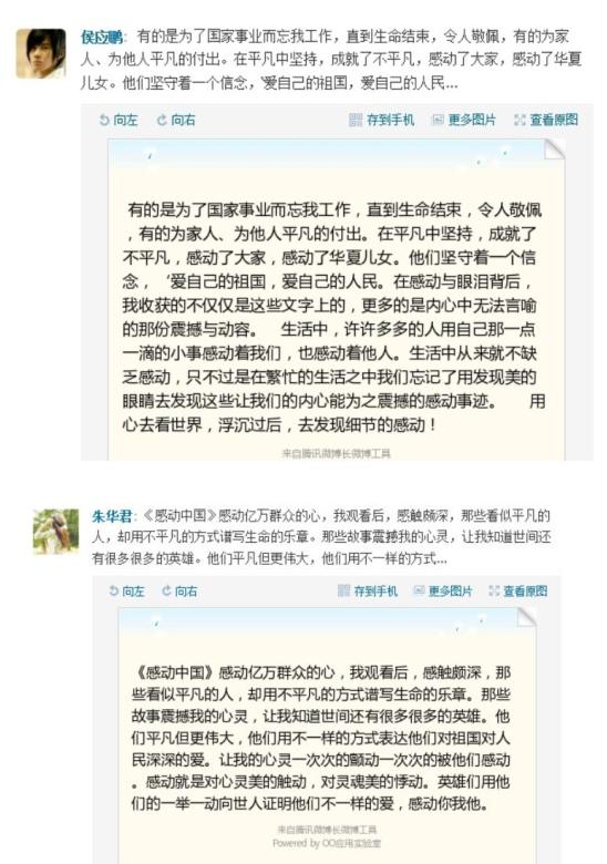 活动过程中,同学们认真观看影片,并记录下自己的观影感受,观影结束后,同学们纷纷表示这是一次心灵的震撼和灵魂的洗礼。接下来的两周时间内,同学们纷纷将自己最深的感触写成一条条微博:“《感动中国》让我们知道爱无处不在,在观影过程中,几度眼眶湿润,都说爱平凡而不平庸,平凡的人在不平凡的岗位上,他们坚守着一个信念:爱祖国,爱自己的同胞。”“我们每个人都有一双隐形的翅膀,发挥自己的努力创造奇迹,我想,真正的感动的确伤感,但同时也化作勇气和信念支持我们前进,有的时候感动让人脆弱,因为它总是触碰人内心最软弱的地方。”