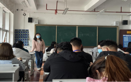 辅导员何老师于5月24号和28日在知行楼303教室开展了学生管理规定等主题班会。何老师从加强学生思想教育工作,创新活动形式,传播正能量。做好疫情动态排查和信息统计上报。强化学生心理疏导,保障积极乐观的心态。培养学生自我管理能力,提高个人素质。等方面来严格管理学生,确保教学秩序,严格按照校规校纪处理。同学们积极配合、严格执行。
